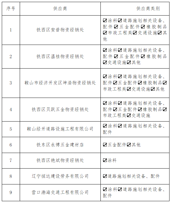 根據(jù)2024年5月11日發(fā)布的《供應(yīng)商入庫公告》要求,經(jīng)過報(bào)名篩選和資質(zhì)審查等程序,確定了9家供應(yīng)商符合入庫條件?,F(xiàn)公布經(jīng)過篩選的供應(yīng)商入庫清單,名單如下: