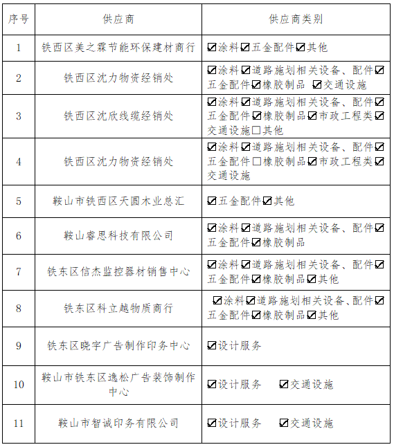 根據2024年5月11日發(fā)布的《供應商入庫公告》要求,經過報名篩選和資質審查等程序,確定了11家供應商符合入庫條件?,F公布經過篩選的供應商入庫清單,名單如下: