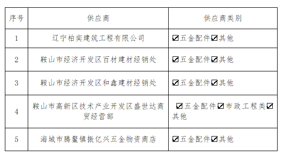 根據(jù)2024年5月11日發(fā)布的《供應商入庫公告》要求,經(jīng)過報名篩選和資質(zhì)審查等程序,確定了5家供應商符合入庫條件。現(xiàn)公布經(jīng)過篩選的供應商入庫清單,名單如下: